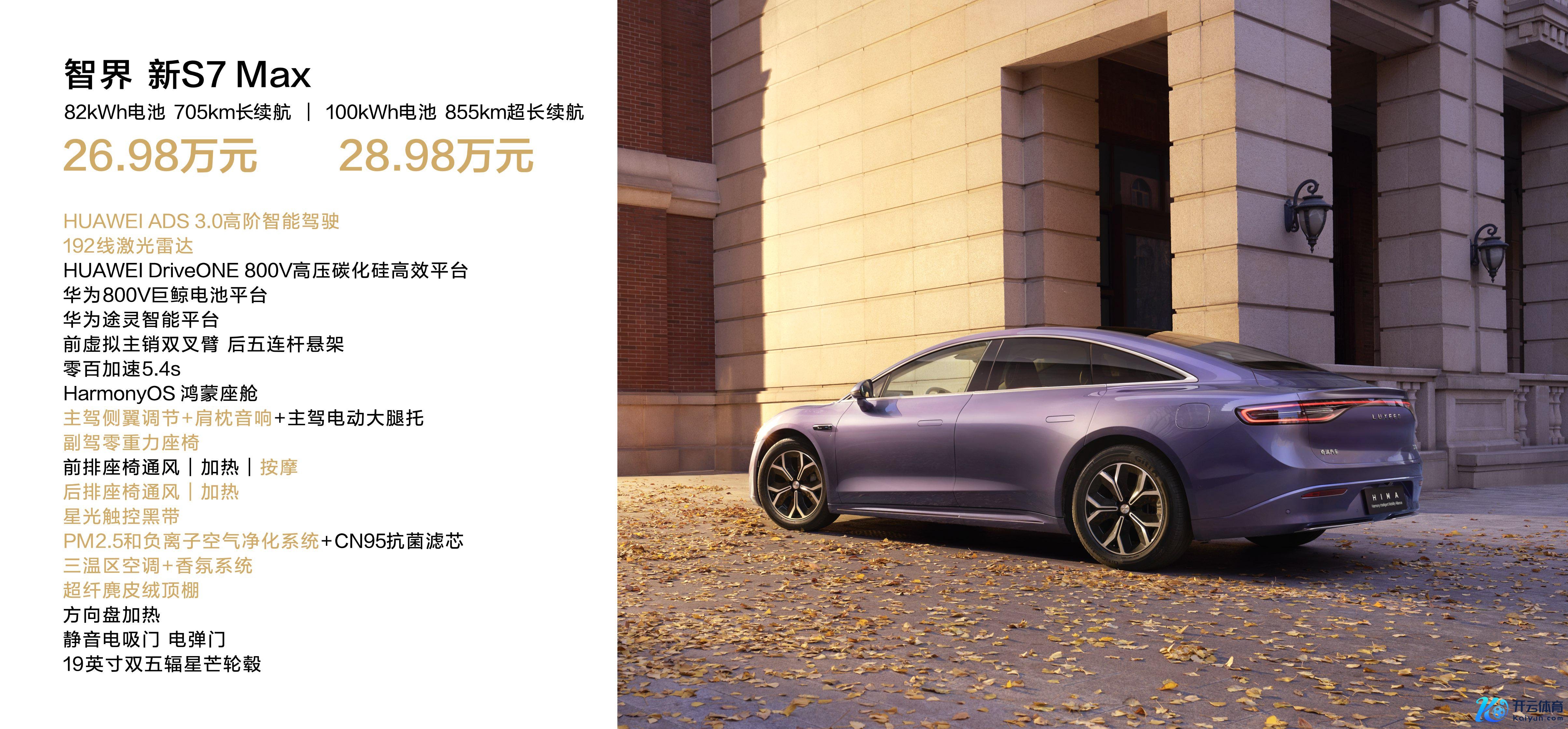 北京本事2024年11月26日,推出新动力汽车智界新S7系列。 智界新S7新增幻影紫、碧波青、晴光蓝和多量会红4款全新车色,全系共有7款车身面孔,弃取一体色打算,更年青,更前卫,称心年青东说念主关于个性与前卫的追求。19英寸和20英寸轮毂弃取全新打算,加上原有的21英寸铸造轮毂,兼顾好意思学和能耗。  性能满配,新系列领有0.203的超低风阻,零百加快低至3.3秒,百零制动距离33.5米,麋鹿测试83.1km/h,最小转弯半径仅5.67米。华为途灵平台以智能独霸性能,协控器件数是传统底盘3倍。 续航方面,新车双800纯电里程无忧,全系标配800V高压超充,纯电续航最长可达855km,领有9万+相助充电站。 软件方面,鸿蒙座舱才气捏续进化,智界S7通过OTA新增优化功能累计超50项,方舟引擎让车机恒久开通如新,还有大模子小艺语音助手、高效适度中心、超等桌面等肤浅体验。用户秘籍安全通常遑急,智界S7在中国智能汽车指数评测中麇集与秘籍安全得分双第一。  智界新S7搭载最新华为ADS 3.0高阶智能驾驶系统,愚弄端到端架构,上车我方开,下车我方停,体验更像“老司机”,让路车成为一种享受。全向防碰撞3.0领有全天候、全场景、超全感知才气,让安全一直在线,冒失移交各式突发情况。    据悉,智界新S7负责上市推出3款车型,智界新S7 Pro售价22.98万元,智界新S7 Max售价26.98万元起,智界新S7 Ultra售价31.98万元。首销期即当前定,至高可享受价值35000元的权力。智界新S7将于12月1日开启寄托。