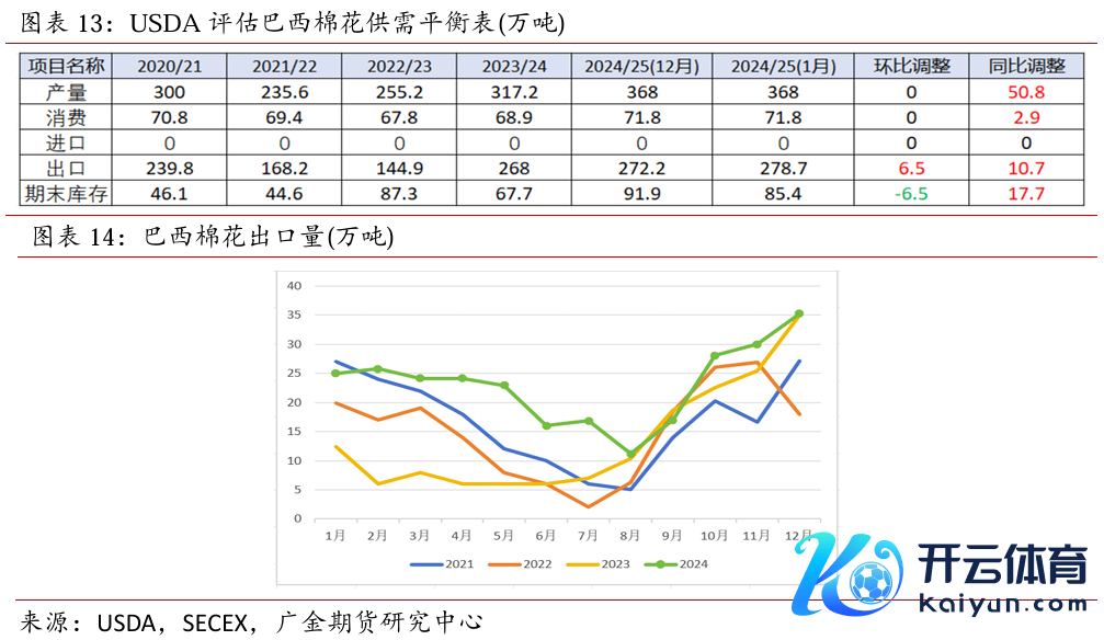 棉花出口依旧位于历史最高点,但由于好意思棉运行辘集装运以及口岸拥挤,巴西棉出口速率有所放缓。巴西对外买卖文牍处(Secex)公布的出口数据涌现,2024年12月巴西出口棉花35.29万吨,同比仅增长0.58%,而10月、11月巴西棉花出口同比增长幅度远隔达到25%、18.05%。