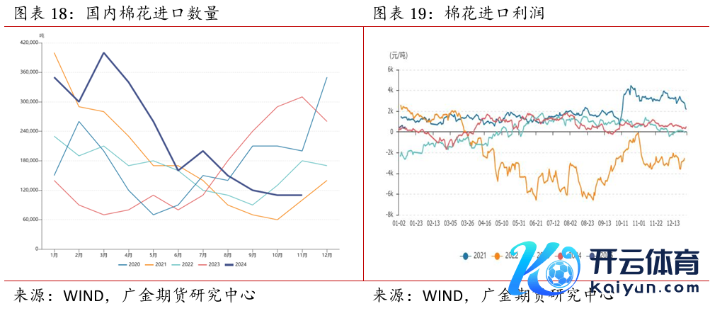 国内商场:(1)供给端,新棉加工处于罢了阶段,产量测度进取USDA预测的653万吨;新棉积极销售“基差+后点价”销售方法占主导,仓单注册量同比依旧大幅减少;从棉花入口起原看,由于入口配额不足、国内终局的外售内销施展不隆起、国储多数入储外棉的可能性较小等原因,9月-11月累计入口量34万吨,同比减少59.5%(2)需求端,织厂终于运行赫然补库,纯棉纱商场本周交投较好,纺企提前休假心愿有所回落,关联词利润并未有赫然普及,企业的现款流依旧病笃(3)库存端,纺企仍是“按需补库,按单采购”的棉花采购策略,制品库存有所消化;织厂颠倒偏低的棉纱原料库存有赫然的补库迹象,但其可捏续性有待闇练,坯布库存不时蓄积。