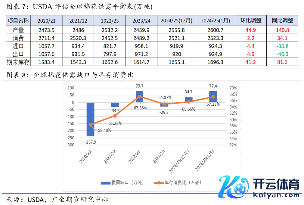 最新的1月USDA供需论述大幅上调产量44.9万吨,主淌若我国棉花产量被上调39.2万吨,澳大利亚棉花上调8.7万吨,况兼好意思棉的产量也巧合地调增(论述发布前来回商测度下调好意思棉),而棉破钞费量却只上调2.2万吨,远不足产量的上调额,因此本月供需缺口较上月加多了42.7万吨,期末库存加多41.2万吨,库存消费比升至67.23%,位于历史偏高水平。