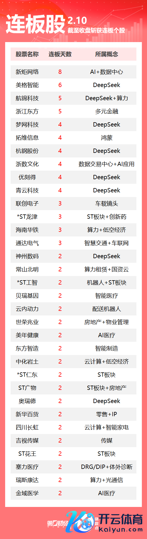 2月10日,数据暴露,A股商场瞎想140只个股涨停。其中数据中心宗旨股新炬收集收成8连板;DeepSeek宗旨多股连板欧洲杯体育,好意思格智能6连板,航锦科技5连板,梦网科技、杭钢股份等4连板。一图速览当天连板股>>