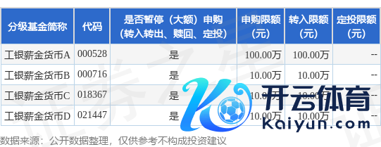 注:1、自2025年9月29日起至2025年9月30日历间,本基金A类份额大额申购、缓助转入、按期定额投资业务收尾金额缓助为100万元。2、自2025年10月9日起,本基金A类份额将复原按照2022年9月17日公告进行收尾,即在非直销销售机构大额申购、缓助转入、按期定额投资业务收尾金额为1亿元,在直销销售机构大额申购、缓助转入、按期定额投资业务收尾金额为100万元,届时将不再另行公告。3、本基金B类份额机构投资者仍按照2025年7月16日公告进行收尾,即大额申购、缓助转入、按期定额投资业务收尾金额仍为10万元;个东说念主投资者仍按照2022年7月7日公告进行收尾,即大额申购、缓助转入、按期定额投资业务收尾金额仍为100万元。4、本基金C类份额机构投资者仍按照2025年7月16日公告进行收尾,即大额申购、缓助转入、按期定额投资业务收尾金额仍为10万元;个东说念主投资者仍按照2023年9月25日公告进行收尾,即大额申购、缓助转入、按期定额投资业务收尾金额为500万元。5、本基金D类份额机构投资者仍按照2025年7月16日公告进行收尾,即大额申购、缓助转入、按期定额投资业务收尾金额仍为10万元;个东说念主投资者仍按照2024年8月20日公告进行收尾,即大额申购、缓助转入、按期定额投资业务收尾金额为1000万元。 以上推作为本站据公开信息整理开yun体育网,由AI算法生成(网信算备310104345710301240019号),不组成投资漠视。