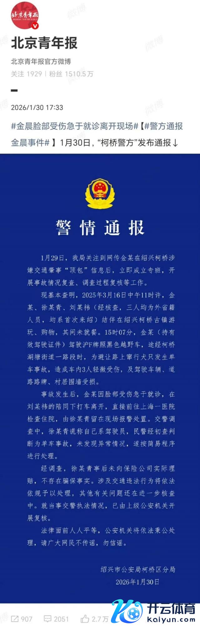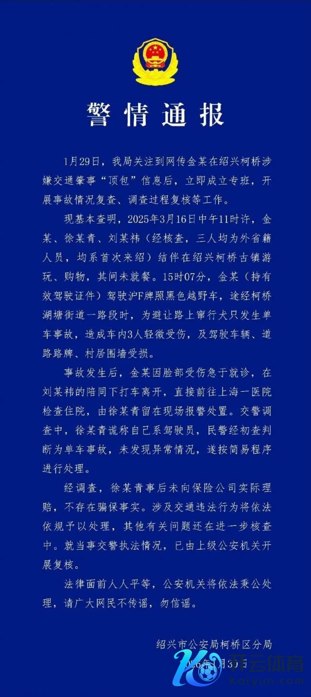 刚刚!对于金晨被爆"滋事叛逃并让助理顶包"的事件核查警方通报了!金晨也发文谈歉了!这事从 1 月 29 日被狗仔爆料发酵,到 30 日绍兴警方火速设置专班组核查发通报、金晨本东谈主发文谈歉,短短两天时期开云体育,剧情回转又回转,网友们看得亦然云里雾里。
