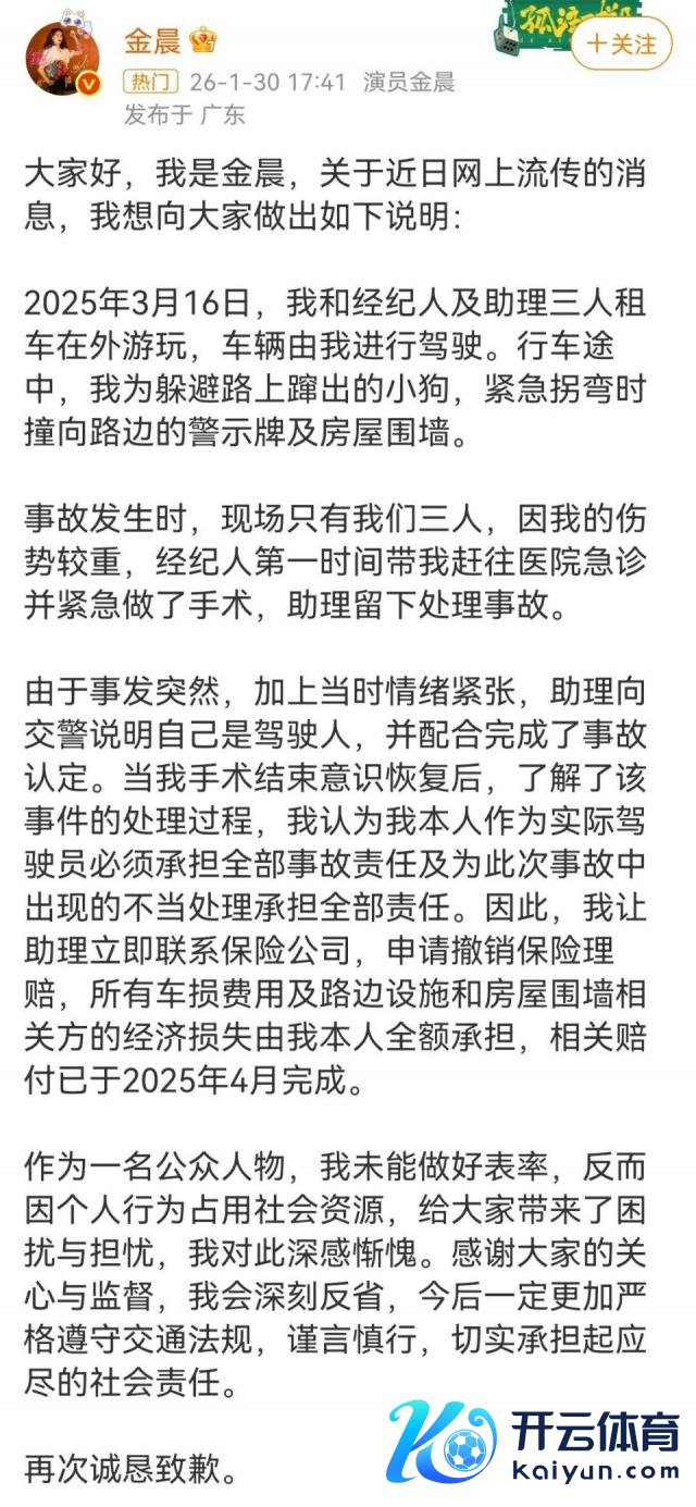 当今我就给全球捋一捋这件事的最新阐述,把警方通报和金晨谈歉里的要害信息,一次性诠释晰。 先打发下配景,这件事并不是刚发生的,而是要记忆到 2025 年 3 月 16 日。 本日下昼,金晨开着一辆沪牌越野车,在绍兴柯桥区的一条路上出事了。据警方通报说,她其时是为了避开顷刻间窜出来的狗,才发生了单车事故,车子撞了路边的警示牌,还撞坏了农户的围墙,车里包括驾驶员金晨在内的三个东谈主齐受了幽微伤。 事故发生后,要点来了。金晨说我方脸部受伤严重,就随着牙东谈主打车去了上海看病,把助理徐长青留在了现场。