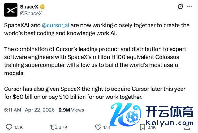 作家 | 王涵 剪辑 | 心缘 智东西4月22日报说念,刚刚,马斯克旗下生意航天巨头SpaceX官推发文称,本年晚些本领或将以600亿好意思元(约合东说念主民币4093亿元)收购好意思国明星AI编程独角兽Cursor,又或为两边的配合支付100亿好意思元(约合东说念主民币682亿元)。