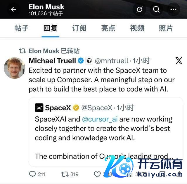 SpaceX官宣(指路:https://x.com/SpaceX/status/2046713419978453374) Cursor CEO Michael Truell立时转发该推文称:“很快意能与SpaceX团队配合,共同延伸Composer。”马斯克也转发了Michael Truell的帖子以示复兴。